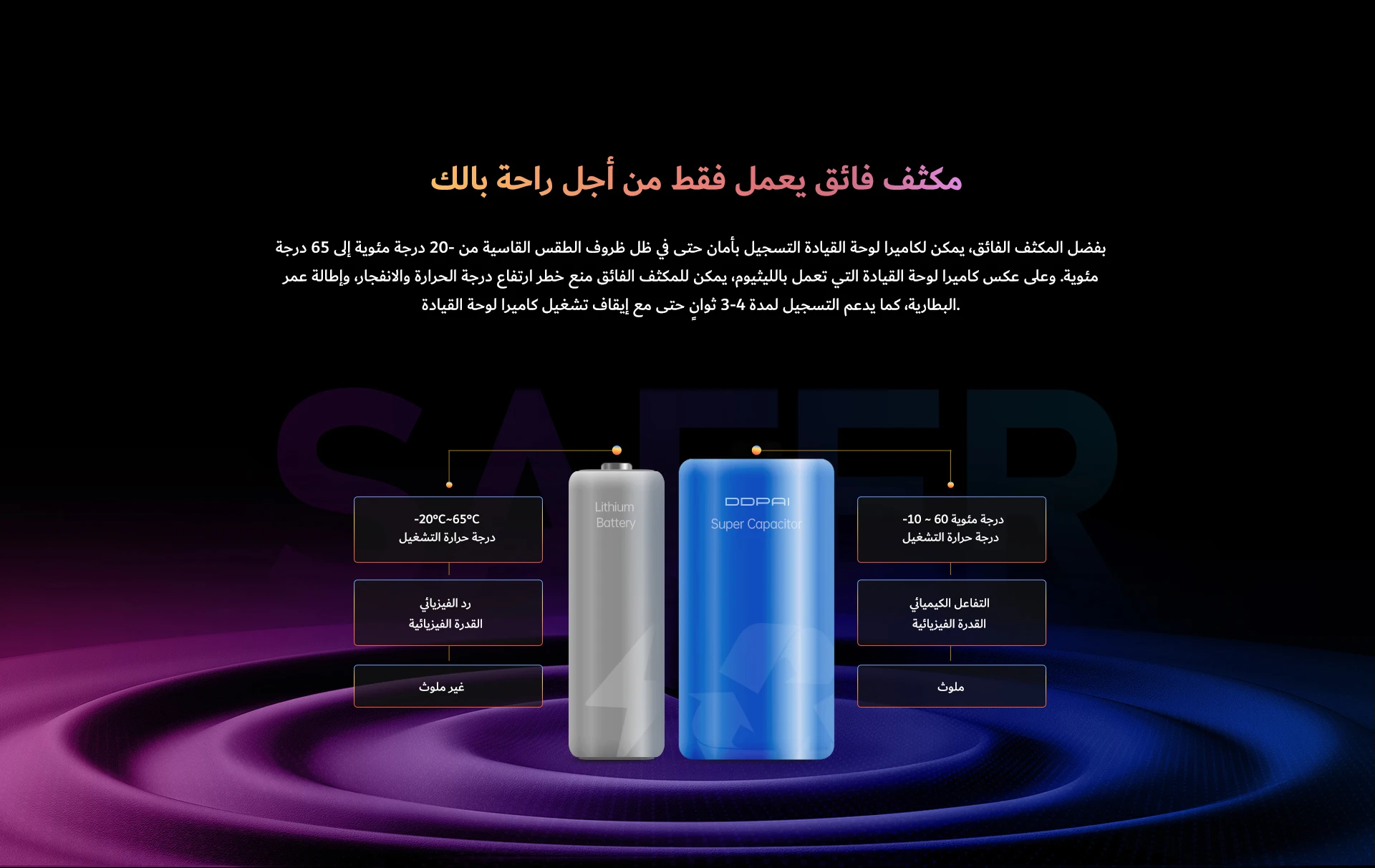 تم تجهيز كاميرا القيادة DDPai Z50 2CH 4K 4K Wifi GPS ببطارية مكثف فائقة. تسمح هذه البطارية للكاميرا بإغلاق نفسها بشكل صحيح بعد فقدان الطاقة. تم تصميم بطاريات المكثفات الفائقة خصيصا للاستخدام في كاميرات القيادة لأنها أكثر متانة من بطاريات البوليمر ليثيوم أيون العادية وهي أيضا أكثر مقاومة لدرجات الحرارة المرتفعة والمنخفضة.