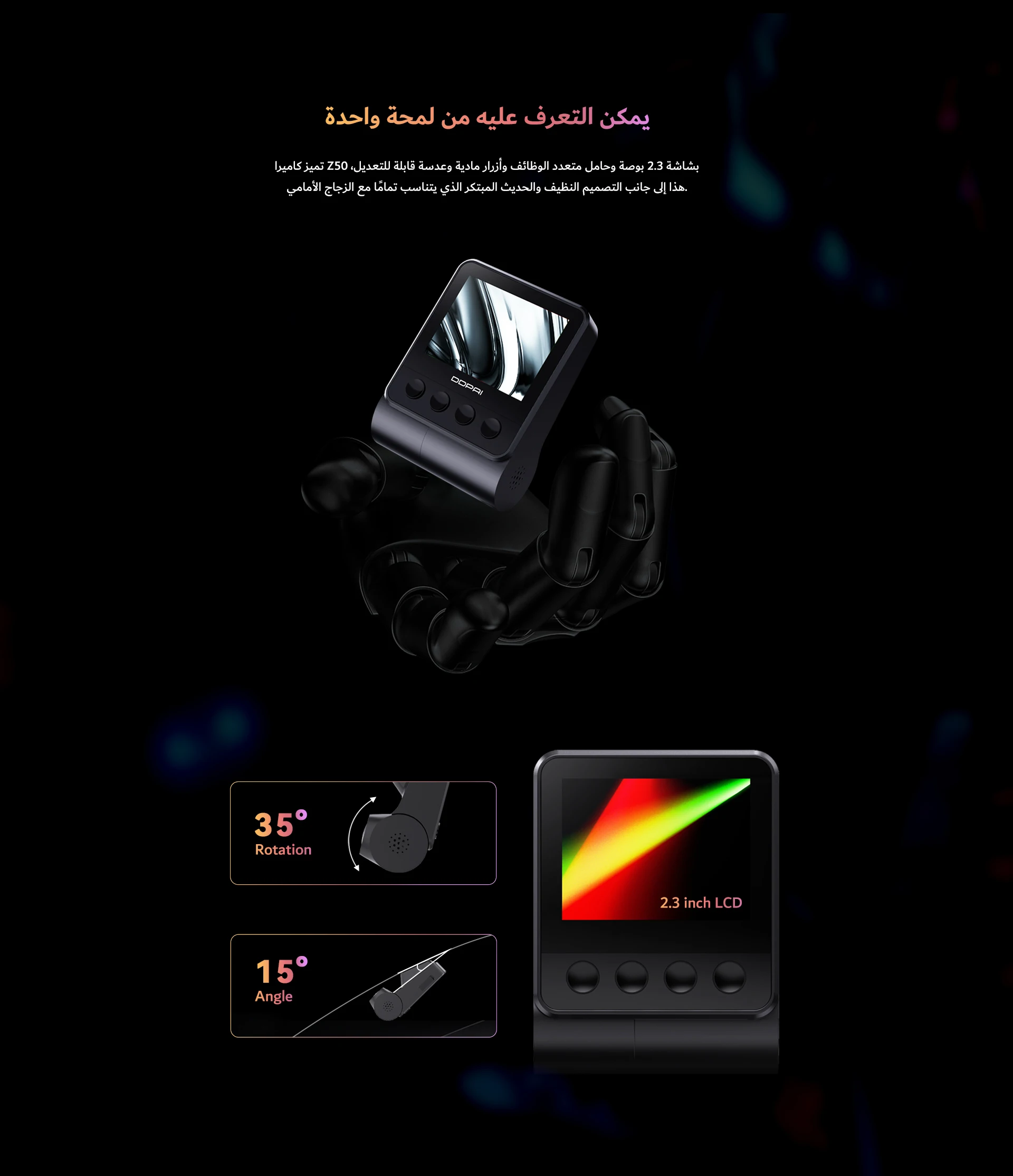 كاميرا DDPai Z50 2CH 2CH 4K Wifi GPS dashcam . تصور بدقة Ultra 4K 3840p حادة جدا في المقدمة و FullHD 1080p في الخلف. علاوة على ذلك، فهي مجهزة بشبكة واي فاي ونظام تحديد المواقع العالمي. على شاشة LCD الساطعة مقاس 2.3 بوصة، تكون القائمة سهلة التشغيل أيضا ويمكنك بسهولة مراجعة اللقطات الملتقطة.